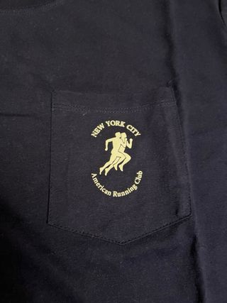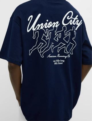 Camiseta azul con estampado gráfico de corredores y texto. - Estampado delantero con Union City y American Running Co.. - Detalle de 145 Mile-long 18th Street en la parte inferior del estampado.