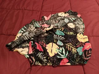Top asimétrico Pull&Bear con un llamativo estampado de hojas en tonos vibrantes sobre fondo negro. Diseño sin una manga, con volante de la misma tela. El tejido es algodón y viscosa, lo que lo hace ligero y cómodo.Solo me lo he puesto una vez.