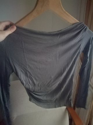 Gris, cuello barco, bastante ajustada y asimétrica con frunces abajo. Nuevo y con etiqueta, de la nueva colección 2024. Precio original: 15.99€.