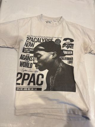 Camiseta con estampado de Tupac Shakur, 2Pacalyse Now. - Diseño frontal con imagen de Tupac. - Texto 2Pacalyse Now y To Live and Die in L.A.. - Estampado Forever California Love en la parte superior derecha.