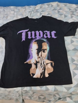 camiseta del famoso rapero Tupac. Es de color negro y tiene una imagen de Tupac con detalles en morado. - Está algo usada