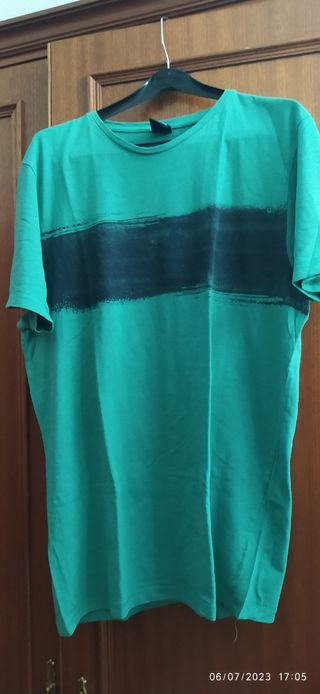 1) Manga corta. Algodón. Estampado delantero. Pull & Bear. Rosa, blanca, negra y azul. Pull & Bear. Talla: M. 2) Manga corta. Algodón. Estampado delantero. Springfield. Talla: M. Verde y azul oscuro.
