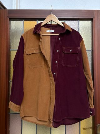 Camisa de pana oversize con diseño de dos colores. - Mangas y parte delantera en color camel. - Cuerpo y mangas en color burdeos. - Cuello camisero. - Cierre de botones. - Dos bolsillos en el pecho.