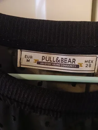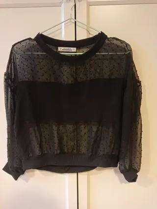 Camiseta negra de Pull and Bear con un diseño moderno y atrevido. - Tejido transparente con topitos. - Banda central opaca. - Mangas largas abullonadas. - Puños y bajo elásticos.