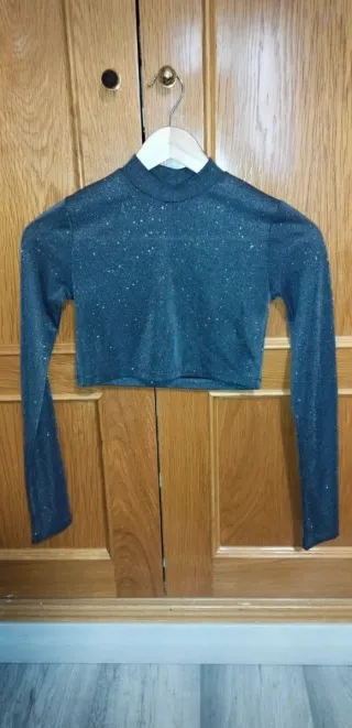 Top de fiesta con brillo metalizado. - Diseño de cuello alto. - Manga larga. - Corte cropped.