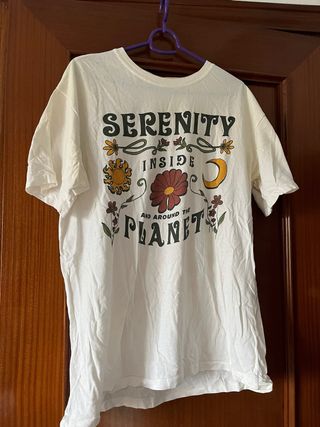 Camiseta blanca con un diseño gráfico llamativo. talla grande, es larga y ancha, material 100% algodón - Estampado Serenity Inside and Round the Planet. - Ilustración con sol, luna y flores.