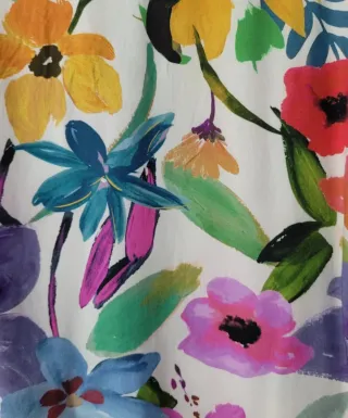 Top asimétrico Pull&Bear con un llamativo estampado de hojas en tonos vibrantes sobre fondo negro. Diseño sin una manga, con volante de la misma tela. El tejido es algodón y viscosa, lo que lo hace ligero y cómodo.Solo me lo he puesto una vez.