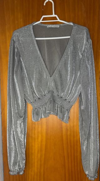 Top de fiesta con un diseño brillante y elegante. Sin estrenar. - Escote pronunciado en V. - Tejido con hilo plateado. - Corte ajustado en la cintura.