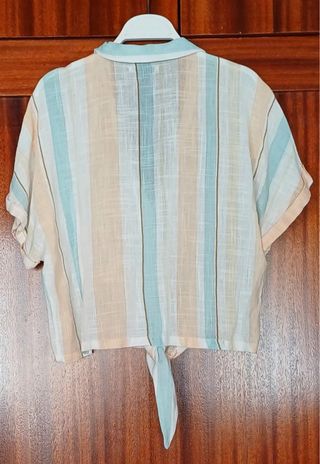 Camisa de Pull and Bear con un diseño de rayas verticales en tonos beige, naranja y azul claro. Presenta un cuello camisero y cierre de botones. - Diseño de rayas verticales. - Cuello camisero. - Cierre de botones. - Nudo delantero.