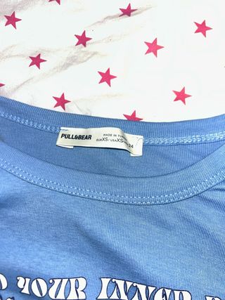 Camiseta corta de Pull&Bear en color azul. - Talla XS (34/6). - Fabricada en Turquía.