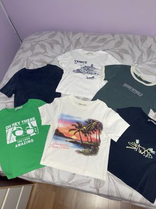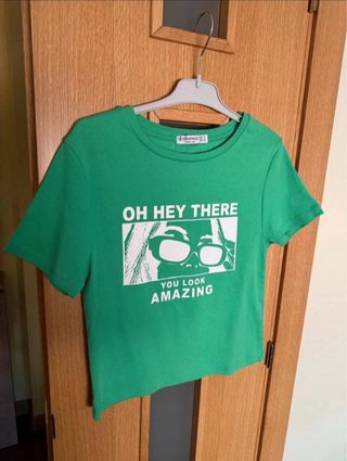 Conjunto de seis camisetas cortas con diferentes estampados. Son cortas y ajustadas. Todas talla M, excepto una S. 4 camisetas de Pull & Bear y 2 de Stradivarius. 5€ cada una. - Camiseta negra lisa - Camiseta blanca con estampado de Venecia - Camiseta verde con diseño gráfico. - Camiseta blanca con paisaje de playa. - Camiseta azul marino con logo. - Camiseta verde con texto Oh hey there.