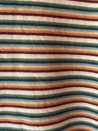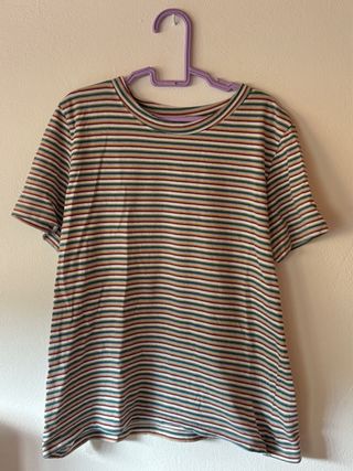 Camiseta de manga corta y cuello redondo con un diseño de rayas horizontales en varios colores.