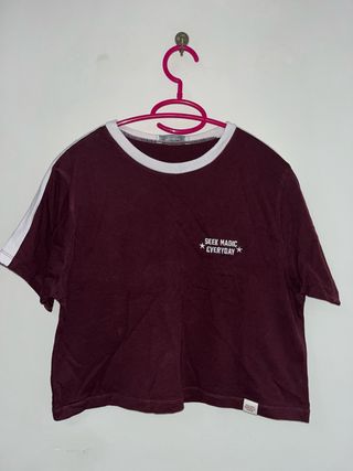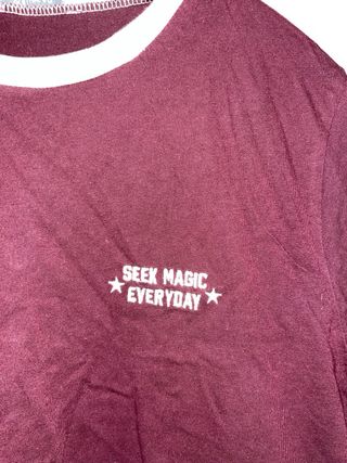 Preciosa camiseta marrón de Pull and Bear. Es una prenda corta, de manga corta, con detalles en blanco en el cuello y las mangas. Tiene un bordado en el pecho que dice "Seek Magic Everyday". - Perfecta para el verano. - Talla única.