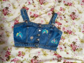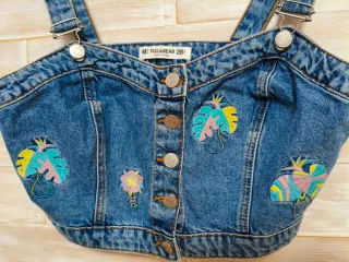 Original top vaquero de Pull&Bear con un diseño único. - Detalle de bordados de hojas tropicales y flores. - Cierre de botones en la parte delantera. - Tirantes ajustables con hebillas metálicas. **SE HACEN LOTES**