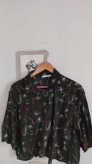 Camisa de Pull&Bear en color verde oliva, talla S. Es una prenda cómoda y de estilo casual. - Corte cropped. - Dos bolsillos de plastrón. - Manga larga. - Cierre de botones.