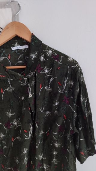 Preciosa camisa de Pull & Bear con estampado floral multicolor. Es una prenda única y llamativa, ideal para darle un toque especial a cualquier look. - Talla M / 38 / 10 - Diseño de flores tropicales