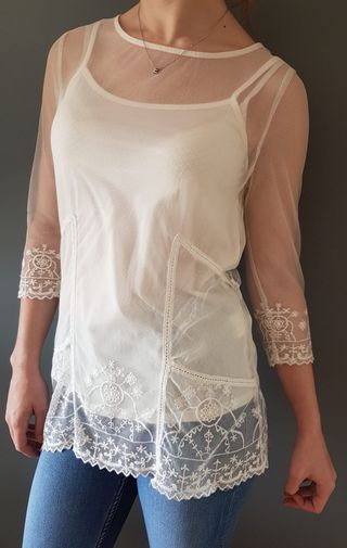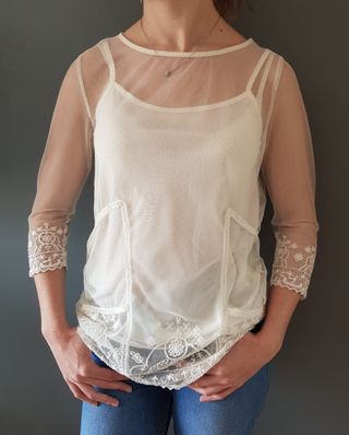 muy poco usada manga tres cuartos Tul bordado con forro de tirantes talla: S medida de hombro a hombro: 36 cm medida de sisa a sisa: 46 cm largo: 63 cm
