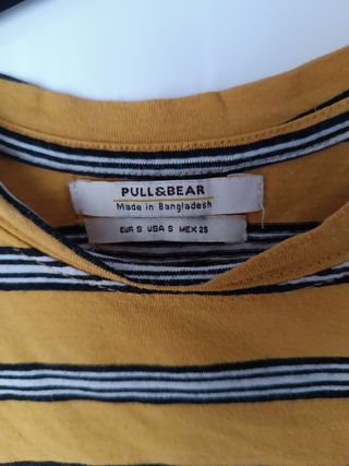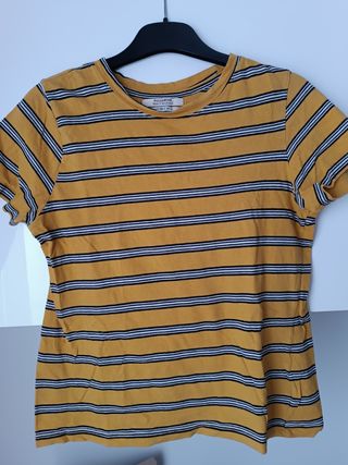 Camiseta de manga corta mostaza con rayas en blanco y negro. Talla S de Pull & Bear, la tela es un poco elástica. Usada pero en buen estado.