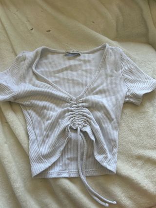 Preciosa camiseta blanca de manga corta. Es de un tejido acanalado y tiene un bonito escote en pico con un detalle de fruncido en la parte delantera. - Es de talla única. - Está en perfecto estado.