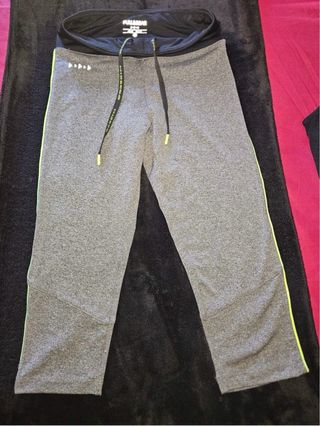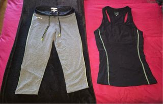 Conjunto deportivo de Pull&Bear que incluye mallas y camiseta. - Mallas grises de corte capri. - Camiseta negra tipo top. - Detalles de costuras en color verde lima.