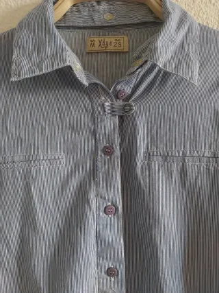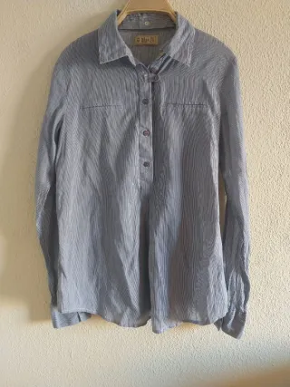 Blusa de rayas finas en tonos azul y blanco. Presenta un diseño clásico con cuello camisero y cierre de botones. - Cuello camisero. - Cierre de botones. - Bolsillos en el pecho.