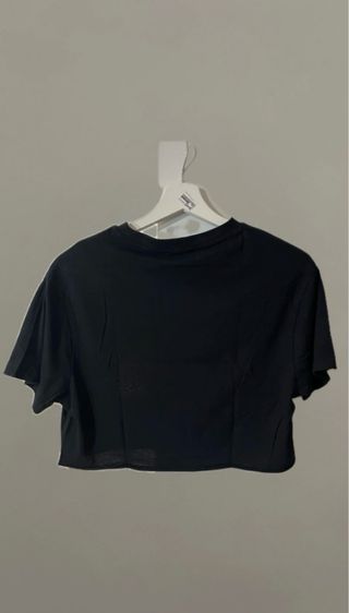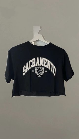 Camiseta negra de manga corta con estampado. - Diseño Sacramento con detalles deportivos. - Corte crop. - Estampado blanco.