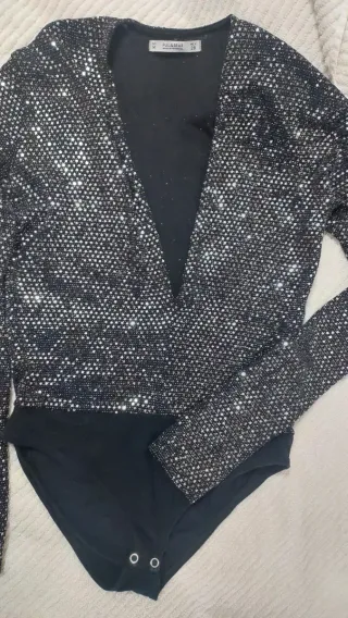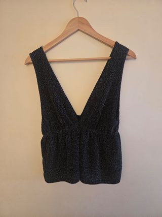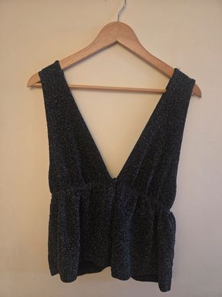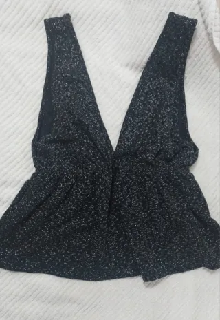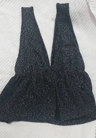 Top brillo negro y plateado. Tiene una apertura en la parte de atrás. Usado una vez.