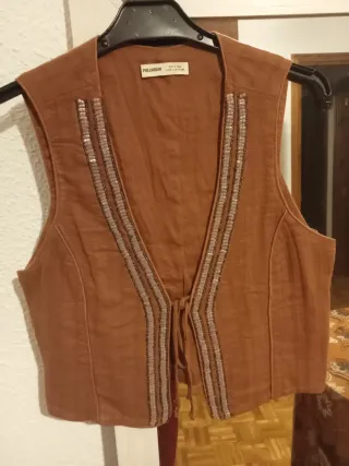 Chaleco abierto con detalles de pedrería y cierre de lazo. - Diseño sin mangas. - Adornos de cuentas y abalorios. - Corte entallado.