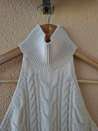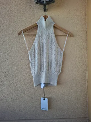 Top halter tejido de ochos en color crudo sin estrenar. No tiene ningún desperfecto. Cierre trasero con botones. Trae uno de repuesto en la etiqueta. Cuello estilo tortuga que aporta elegancia. Espalda descubierta. Tejido suave al tacto. Ofrece un look veraniego y fresco. Medidas: - Largo: 46 cm - Bajo: 23 cm - Axila a axila: 34 cm Talla S (36) Mujer, Pull&Bear. Precio original tienda: 17,99€ Envíos rápidos. Descuento por lote activo. Para más información contacten conmigo por privado ℹ️