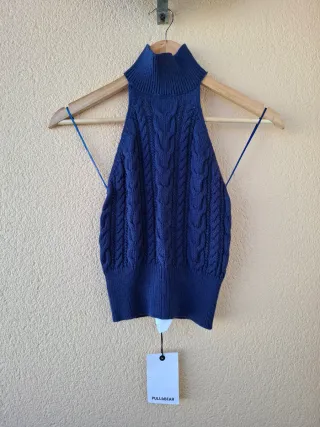 Top halter tejido de ochos en color azul marino sin estrenar. No tiene ningún desperfecto. Cierre trasero con botones. Trae uno de repuesto en la etiqueta. Cuello estilo tortuga que aporta elegancia. Espalda descubierta. Tejido suave al tacto. Ofrece un look veraniego y fresco. Medidas: - Largo: 46 cm - Bajo: 23 cm - Axila a axila: 34 cm Talla S (36) Mujer, Pull&Bear. Precio original tienda: 17,99€ Envíos rápidos. Descuento por lote activo. Para más información contacten conmigo por privado ℹ️