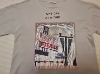 Camiseta de algodón de Pull & Bear con un diseño gráfico frontal. - Estampado con texto COFFEE STEAKS. - Frase ONE DAY AT A TIME en la parte superior.
