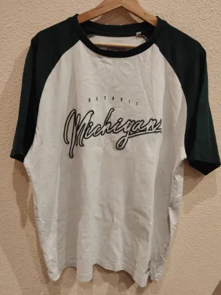 Camiseta de estilo raglán con mangas verdes y cuerpo blanco, con un diseño gráfico de Detroit Michigan. - Diseño oversize. - Mangas de color verde oscuro. - Cuerpo de color blanco. - Estampado gráfico delantero. 46 cm de axila a axila,70 cm largo , muy buen estado, talla m
