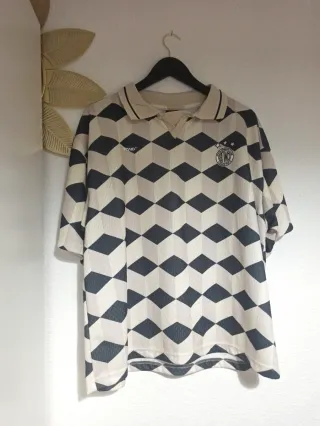 Camiseta de estilo futbolístico con un diseño llamativo. - Estampado de formas circulares y líneas blancas. - Cuello blanco. - Logo de STWD en el pecho.
