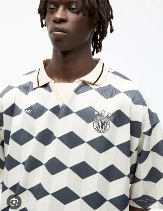 Camiseta polo de manga corta con un llamativo diseño geométrico. - Estampado de rombos en tonos beige y gris Talla M Recoger cerca del metro Oporto