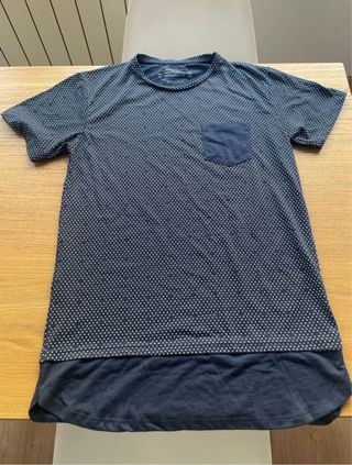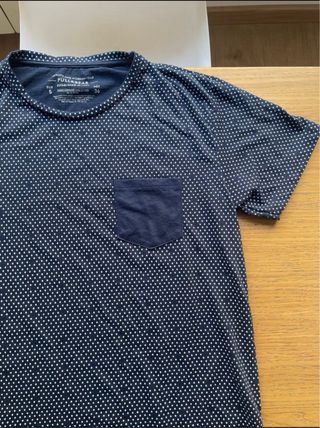 Camiseta de la marca Pull & Bear. Es de color azul marino y tiene un estampado de lunares blancos. La camiseta está nueva porque nunca ha sido usada por error de talla.