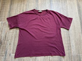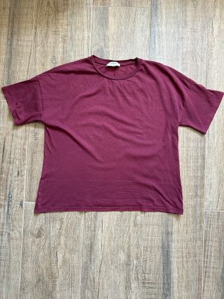 Camiseta de algodón comprada en Pull&Bear. Talla S de mujer pero oversize. Buen estado. Se vende porque no se utiliza. Es un tono granate apagado / burdeos. Costó 9,99 €.