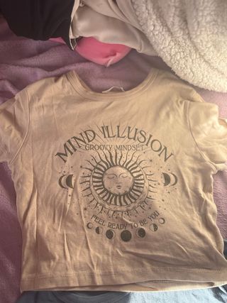 Dos tops de la marca Pull&Bear, prácticamente nuevos. - Diseño con estampado de sol y lunas. - Estilo groovy mindset con mensaje Feel Ready To Be You. - Manga corta y cuello redondo.