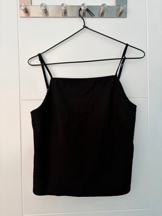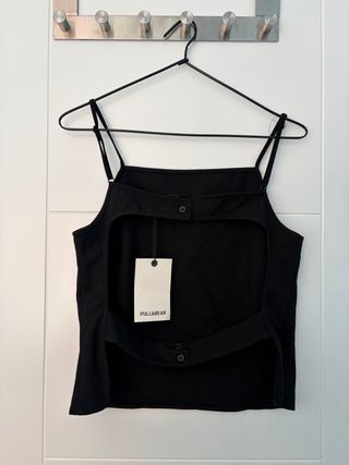Top negro de Pull&Bear con etiqueta. - Diseño con tirantes finos. - Abertura en la espalda con botones. - Detalle de banda en la espalda