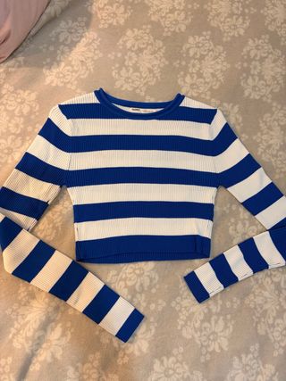 Top de punto con diseño de rayas y cremallera frontal. - Diseño de rayas marineras. - Cremallera completa en la parte delantera. - Cuello tipo polo. El cuello permite dejar los hombros al descubierto, o no, según gusto Nunca usado aunque se le cortó la etiqueta interior x ser demasiado grande, pero nunca usado x ser muy pequeño para mi