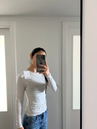 Top de manga larga con un diseño fruncido en el delantero. Es una prenda versátil y cómoda. - Cuello redondo. - Puños ajustados.