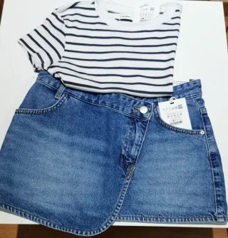 Conjunto de camiseta a rayas y falda vaquera. - Camiseta de manga corta con cuello redondo. - Falda vaquera con diseño cruzado y bolsillos.