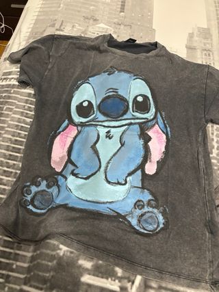 Pack de dos camisetas de Pull&Bear. - Camiseta gris con estampado de Stitch. - Camiseta gris con dibujo artístico.