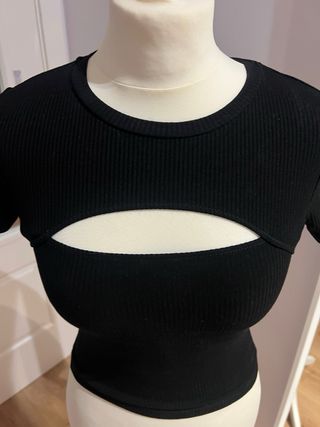 Top de Pull&Bear con un diseño moderno y atrevido. - Tejido principal negro. - Detalle de transparencias en la zona del cuello y hombros. - Corte asimétrico.