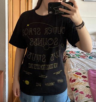 Camiseta negra con un diseño.Está sin estrenar. - Diseño con planetas y círculos. - Cuello redondo y manga corta.
