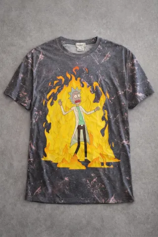 Camiseta con estampado de Rick Sanchez en llamas. - Diseño llamativo de la serie Rick and Morty. - Estampado integral con efecto desgastado.