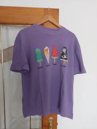 Lote de seis camisetas de talla L con un diseño divertido de helados. - Camiseta morada con estampado. - Estampado multicolor con helados. - Talla L.