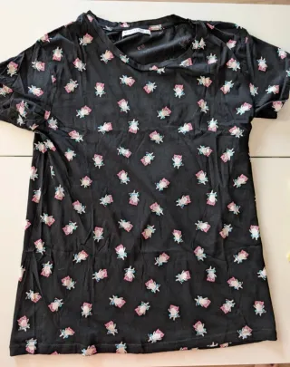 Camiseta negra de Pull&Bear con un diseño de corona en la parte delantera. Estampado de corona con detalles. Manga corta. Estilo largo Talla M Pull and bear no muy suelta no muy apretada Medidas Hombros: 41cm Cuello: 29cm Escote: 12cm Pecho: 41cm Cintura: 44cm Cadera: 55cm Longitud: 58cm Usada Una vez o dos Muy bien estado, sin manchas ni rotos