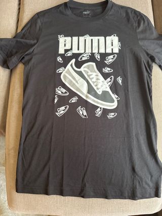 Camiseta negra de la marca Puma con un diseño original. - Estampado frontal con el logo de Puma y zapatillas. - Manga corta. - Cuello redondo.