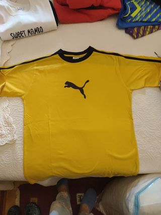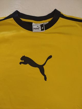 camiseta de la marca Puma, talla M grande, mide 55 cm de axila a axila y 72 de largo. Es de color amarillo y tiene detalles en negro. - La camiseta está en muy buen estado.