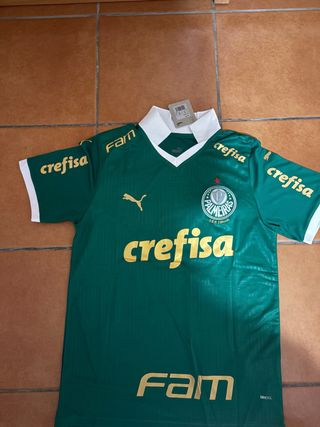 Camiseta oficial del Palmeiras para la temporada 2024/2025. - Diseño moderno en color verde. - Detalles en dorado. - Cuello blanco.